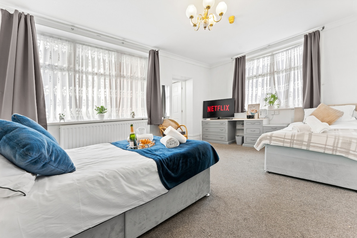 Hermosa unidad independiente de nueva construcción situada en el primer piso de un edificio independiente dentro de los límites de una casa familiar. Amplia sala de estar/dormitorio que incluye una lujosa cama tamaño king, zona de estar y utensilios para preparar té y café. Zona de cocina recién instalada con nevera, horno y microondas. Gran televisor inteligente. El sofá cama adicional hace que la suite sea perfecta para familias. Baño independiente con ducha eléctrica. Zona de estar exterior privada con vistas a la hermosa campiña de Monmouthshire.