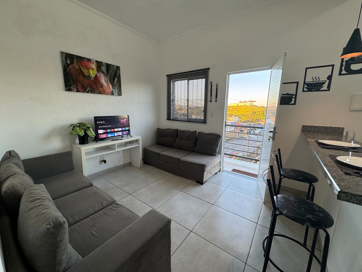 Estudio Londres – Piscina, 300 Mb Wi-Fi y garaje. Nuevo estudio de 32 m², moderno y acogedor, con aire acondicionado frío/calor y ajuar de hotel estándar. Cocina equipada con estufa de inducción, microondas, minibar, cafetera Dolce Gusto y purificador. Televisor inteligente de 50 pulgadas, wifi rápido y balcón. Ubicado en la zona privilegiada de Três Corações, a solo 4 km de la autopista Fernão Dias.