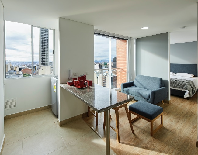 Acogedor apartamento, el cual cuenta con cama doble, televisor, escritorio, sofá, armario, baño privado y cocina con todos los implementos y electrodomesticos necesarios para uso del huésped, todo nuevo. El conjunto esta ubicado en una zona muy central, cerca del centro historico e internacional, donde se encuentran los mayores atractivos de Bogotá. Con vias de facil acceso y sistemas de trasporte publico que conectan el centro con el aeropuerto y la terminal de transporte.