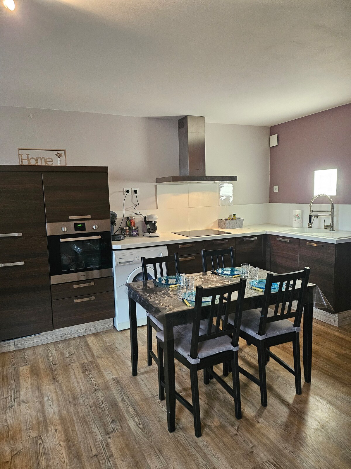 Nid douillet privé en entresol dans ancien hôtel rénové au cœur du village en desertification de Rochefort Montagne idéal pour randonnée, ski, et découverte de l'auvergne, du Sancy et de la chaine des puys. Baignoire à remous, climatisation, lit Emperor (2x2m), Matelas EMMA sur lattes, cuisine toute équipée avec lave vaisselle, four, four micro ondes, batterie d'ustensiles, fondue, crêpe, raclette, feux gaz et plaques induction, réfrigérateur SMEG, lave linge, sèche linge, TV LG