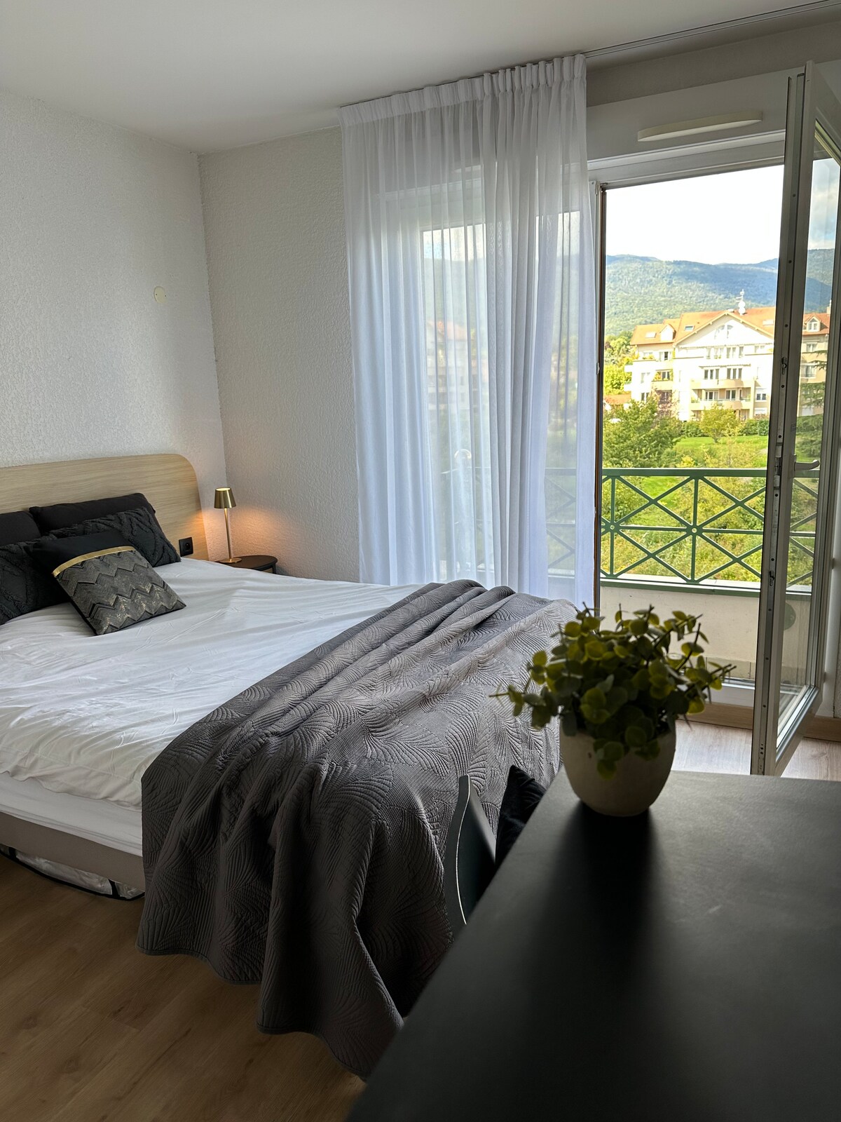 Entièrement rénové et soigneusement équipé, cet appartement allie confort et praticité. Il dispose d'une cuisine fonctionnelle, de la climatisation pour les journées et nuits chaudes, ainsi qu'une agréable terrasse. Idéalement situé, il se trouve à seulement 5 minutes à pied du Lac de Divonne, parfait pour de belles balades au bord de l'eau, et à 5 minutes également des commerces et restaurants du centre-ville, accessibles par un chemin longeant un petit ruisseau.
