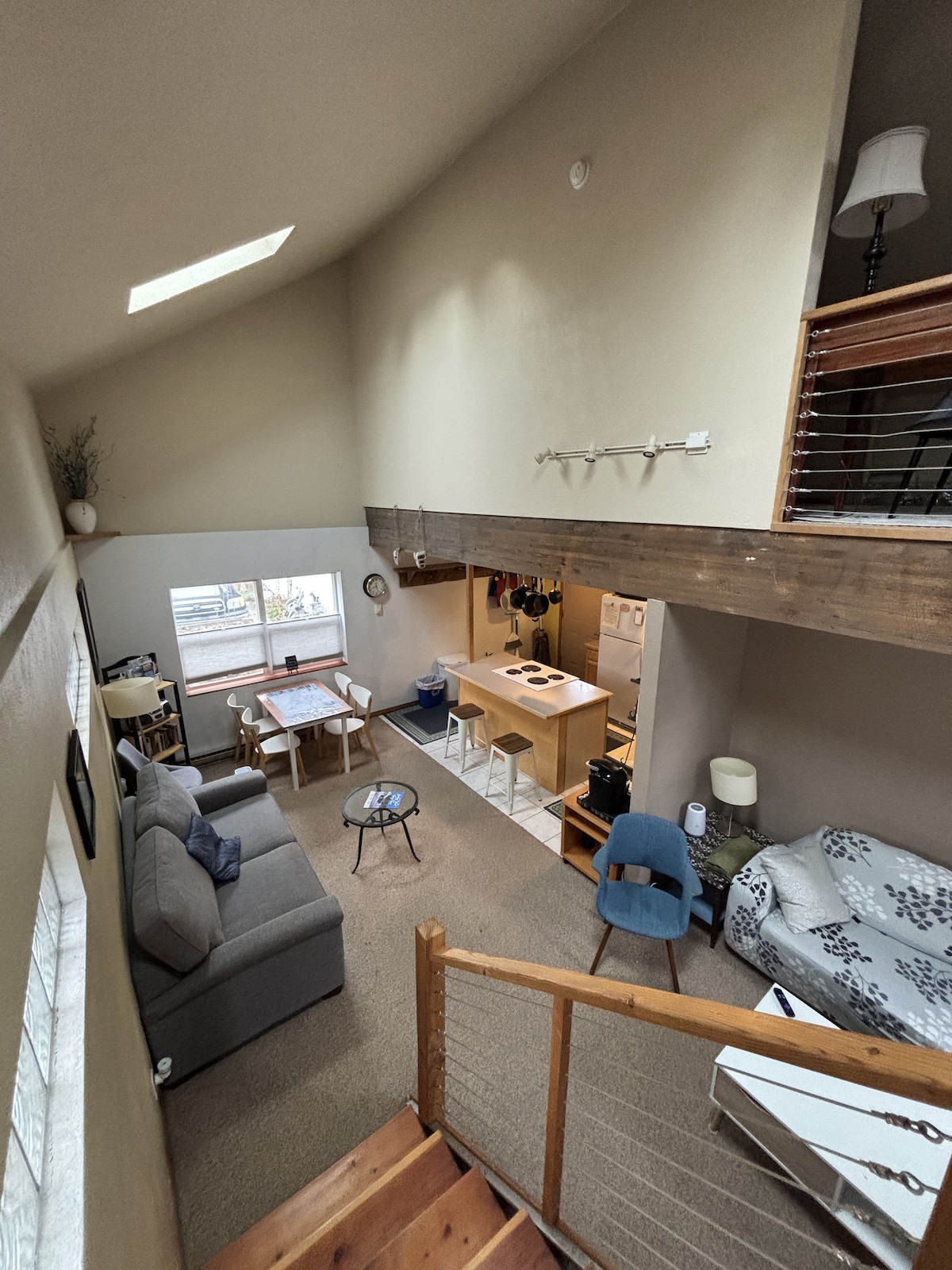 Tu propia entrada privada con un dormitorio con cama tamaño queen, más una sala de estar con sofá cama futón y un baño. La sala de estar tiene TV inteligente y equipo de música bluetooth. Esta vivienda del segundo piso no tiene cocina, pero se encuentra en un barrio tranquilo a solo 2 manzanas de restaurantes, tiendas y vida nocturna en el centro de Bozeman. Zona de entrada adicional con nevera, cafetera/tetera y agua filtrada. Un montón de vasos, platos y utensilios para comidas que no requieren cocinar. -STR23-00001