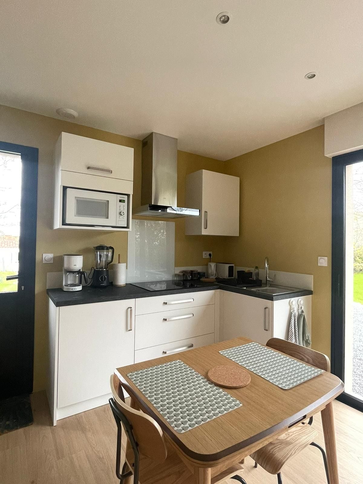 Idealmente situado en VERTOU, cerca del parque de Loiry. Estudio independiente de 25 m². Porche con SPA privado accesible durante todo el año. Cama plegable de alta gama. 160*200 Comodidad garantizada También puede, si lo desea, tener una zona de sofá para disfrutar de una televisión de gran formato. wifi: 500 Mb Cocina: Lavavajillas, nevera, microondas, horno, placa de inducción, cafetera Nespresso. Alojamiento ideal para una noche romántica. Acceso privado e ilimitado al SPA de alta gama.