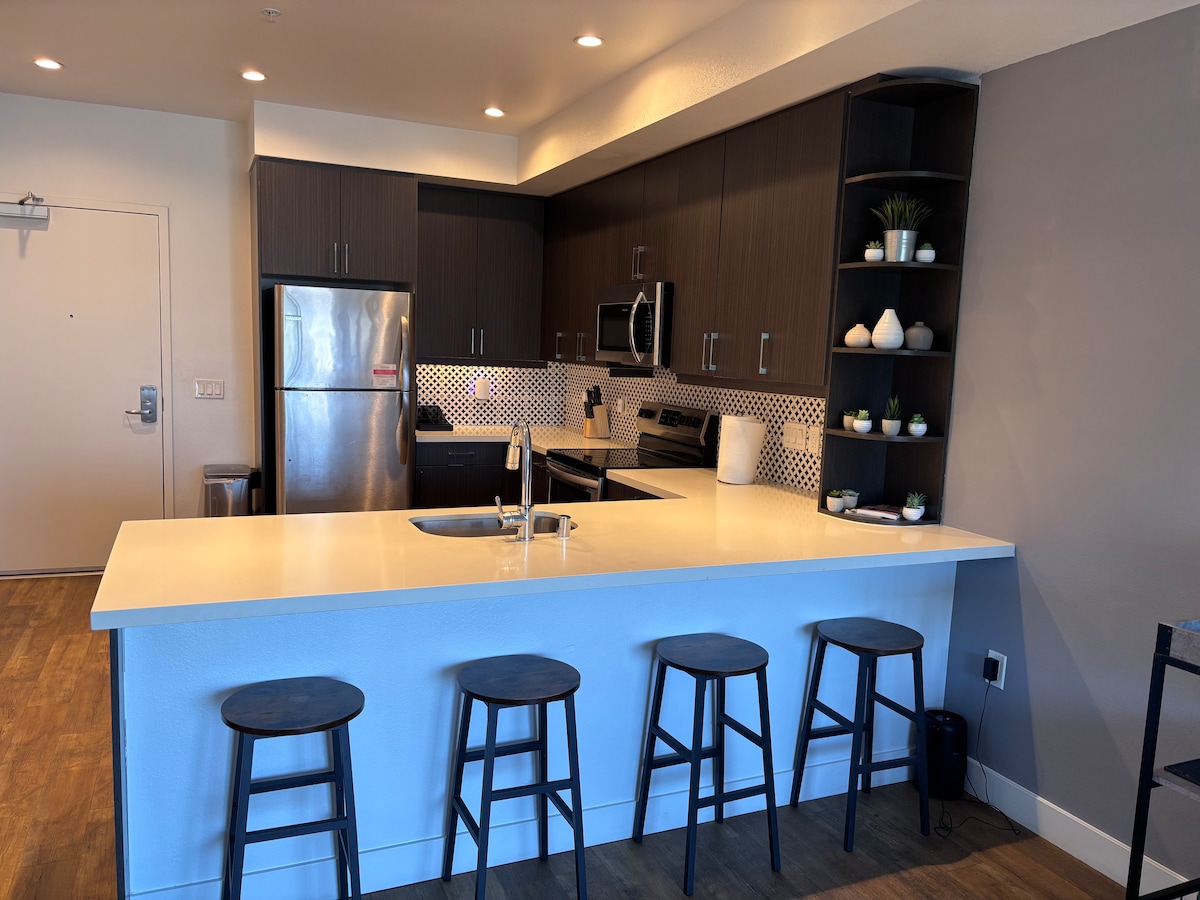 The newly remodeled 1340 sq. ft. spacious home is located on the top floor with best view to the sky pool deck inside of Atlantic Time Square, walking distance to the shops, restaurants, movie theater on the ground level. Safety smart lock and 24h security gate with private parking space. Relaxing Southern California sunshine with pool view, private balcony, and large south facing windows. 65” Smart TV with cable, and Nest Smart Thermal to keep the temperature constant at night for you.