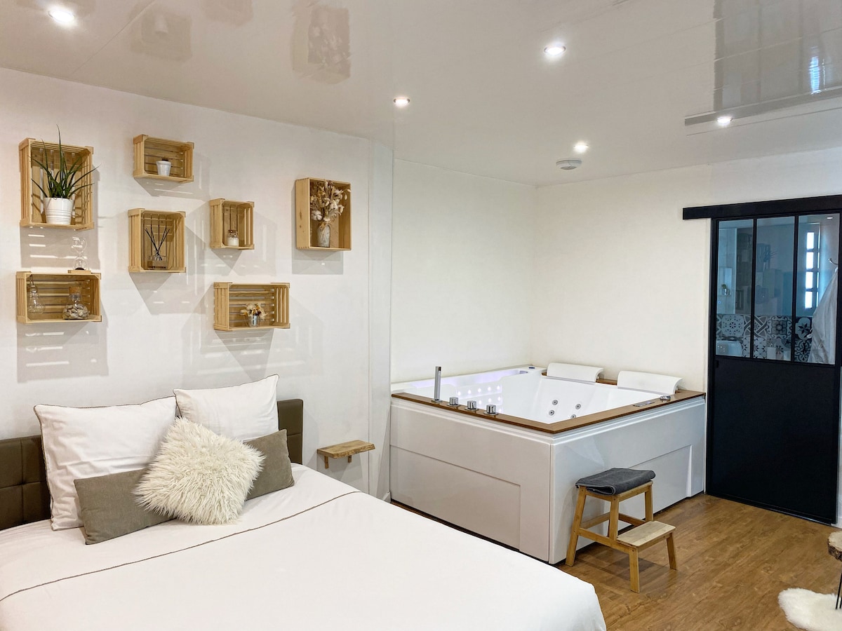 ¿Ganas de calma y descanso? ¿Necesitas encontrarte, recargar energías y tomarte tu tiempo? Descubre nuestra Habitación Spa en el corazón del centro de la ciudad de Besançon. Este pequeño nido tiene una ducha muy grande a ras de suelo, un spa privado, una pantalla plana, una pequeña cocina … Pequeños dulces estarán a su disposición en el alojamiento. Apartamento disponible desde las 17:30 hasta las 11:00 del día siguiente. Posibilidad de añadir opciones (bandeja de comida, decoraciones...) Au Doubs Rêve
