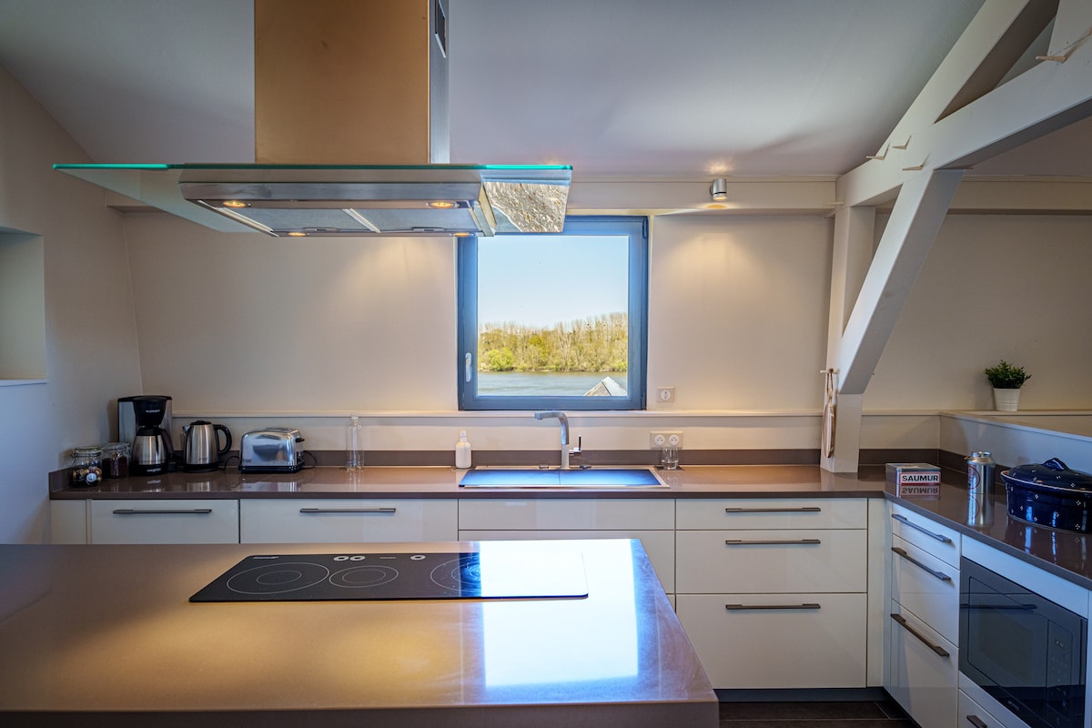La Maison Haute est une superbe maison de marinier qui surplombe la Loire. La maison a été totalement rénovée dans des matériaux nobles avec des plafonds à poutres apparentes et des détails anciens pour une sensation de luxe et de charme. Profitez de la vue sur la Loire et les toits de Montsoreau, classé parmi les plus beaux villages de France. Les restaurants et les commerces du village sont à 3 mn à pied. Saumur est à 15 km, Chinon à 25 km et l'abbaye royale de Fontevraud à 5 km.