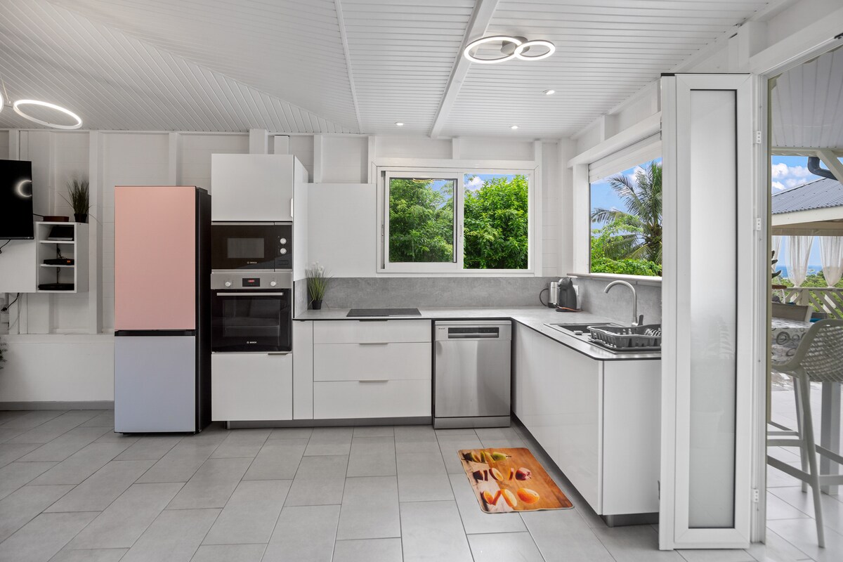 ¡Maravillosas vistas del mar Caribe! Muy bonita villa, tranquila y relajante, situada en una residencia tan popular, con vistas a la gran bahía. Los despertares son luminosos y las puestas de sol quitan el aliento. El primer baño de mar a 4 minutos en auto. La villa está amueblada con buen gusto, materiales de calidad y totalmente equipada. Piscina de sal. Jardín. Barbacoa. Ubicación ideal para recorrer toda la isla. Estacionamiento privado seguro para 2 autos. Supermercado a 5 minutos.