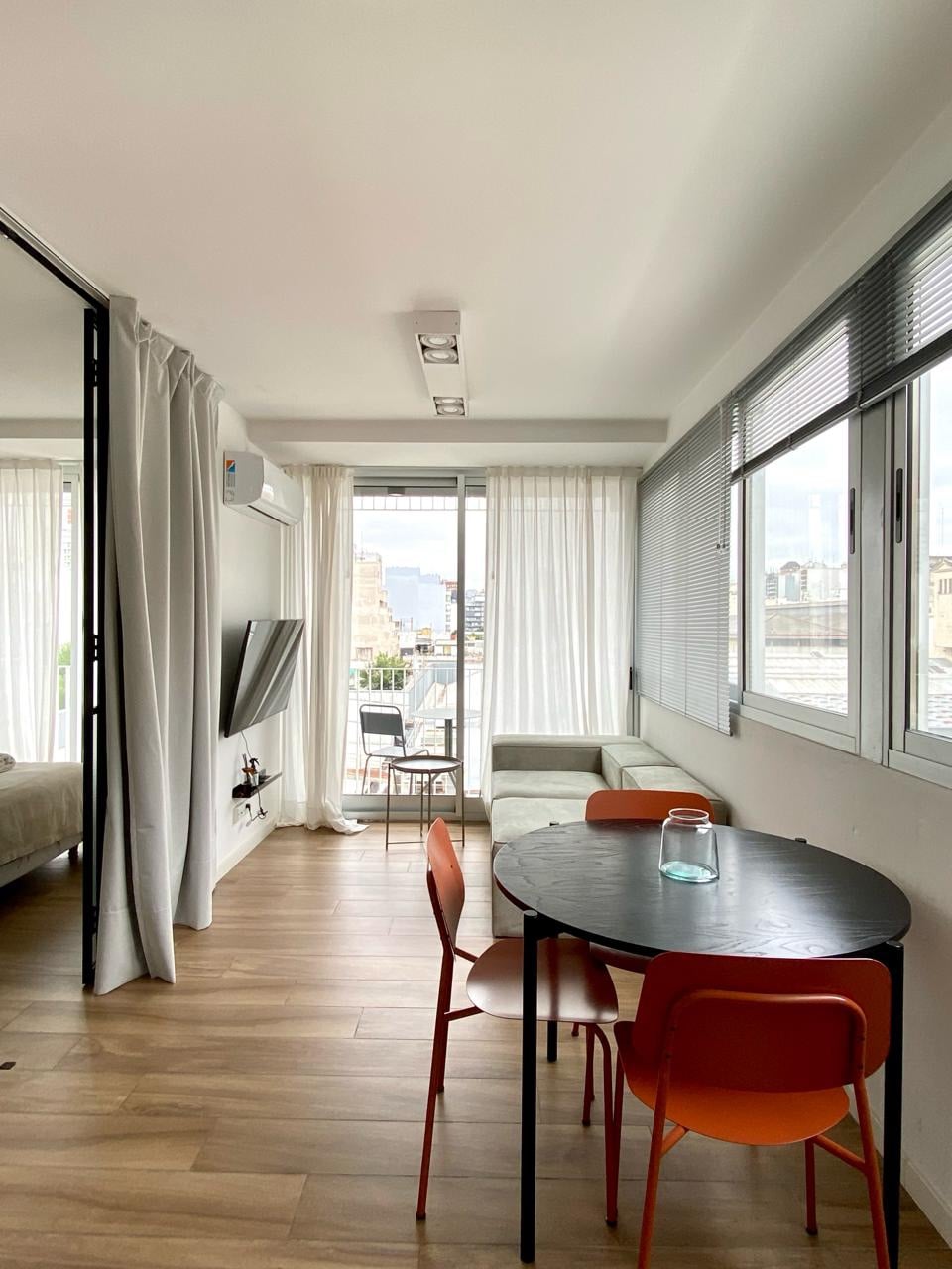 Departamento contemporáneo y completamente nuevo, con una ubicación privilegiada dentro del barrio de Palermo Hollywood. Monoambiente con cama Queen que se puede adaptar a dos camas individuales. Balcón con vista abierta a la ciudad. Baño y cocina completa. Equipado con todo lo que necesitas, incluida una TV de 55 pulgadas para tu entretenimiento. Su diseño de vanguardia y comodidades de primera hacen de este espacio la opción ideal para una estadía cómoda y con estilo.