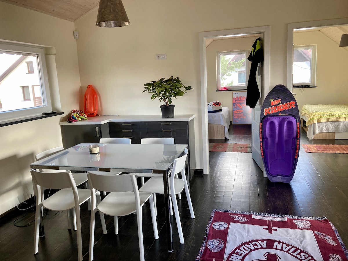 La casa fue construida en estilo escandinavo, está situada justo en la orilla del lago Juksty (a unos 40 m), está totalmente equipada, en la terraza hay muebles de jardín, tumbonas y una parrilla. En la parcela también hay una cancha de voleibol, bicicletas, parque infantil, bicicleta acuática, pontón con remos, 2 kayaks, tablas de paddle surf y un puente con escalera al agua.