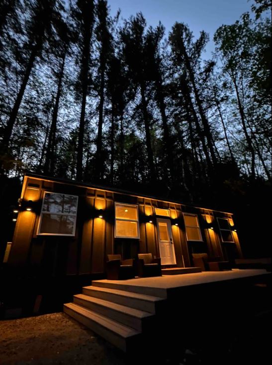 This stunning waterfall-front retreat is the perfect springboard for your outdoor adventures or for the "tiny-home-curious" who want a luxury tiny-home experience without tie-dyed curtains and bedroom-lofts to fall from during midnight restroom excursions. Experience the great outdoors without getting any on you from the deck overlooking the river and sunset colored mountains. Wake among the trees and experience the joy of camping with the luxuries of modern convenience at your fingertips.
