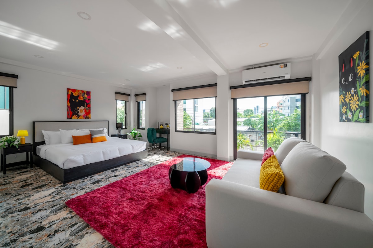 Estudio familiar moderno cerca de MRT en Nonthaburi. Cuenta con una cama tamaño king y un gran sofá cama con capacidad para dos personas más, perfecto para familias o grupos pequeños. Incluye TV inteligente, aire acondicionado, wifi rápido, baño privado, cortinas opacas y ventanas grandes. Disfruta de un espacio limpio, elegante y totalmente equipado a pocos minutos del MRT, ideal para parejas, familias o nómadas digitales que buscan comodidad a las afueras de Bangkok.