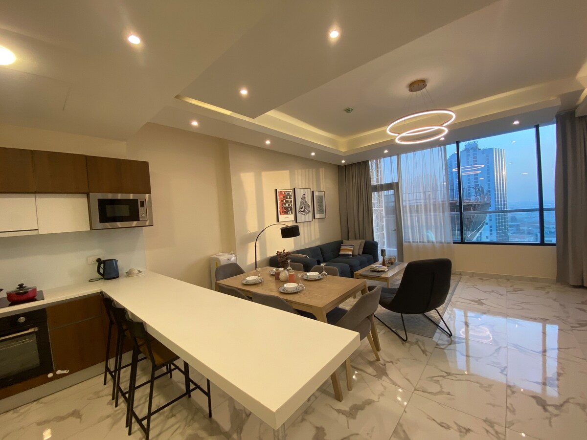 Find your inner peace and enjoy the most stunning view in this newly built apartment in Era View, Manama. This exquisite apartment #343 situated on the 34th floor, features a balcony(city/sea view), a cozy living room, bedroom with feather beddings, a fully equipped kitchen, dining area, toilet with free toiletries, two Smart 55-inches TVs (Netflix/Amazon Prime available), and high-speed internet access ideal for work and personal use.