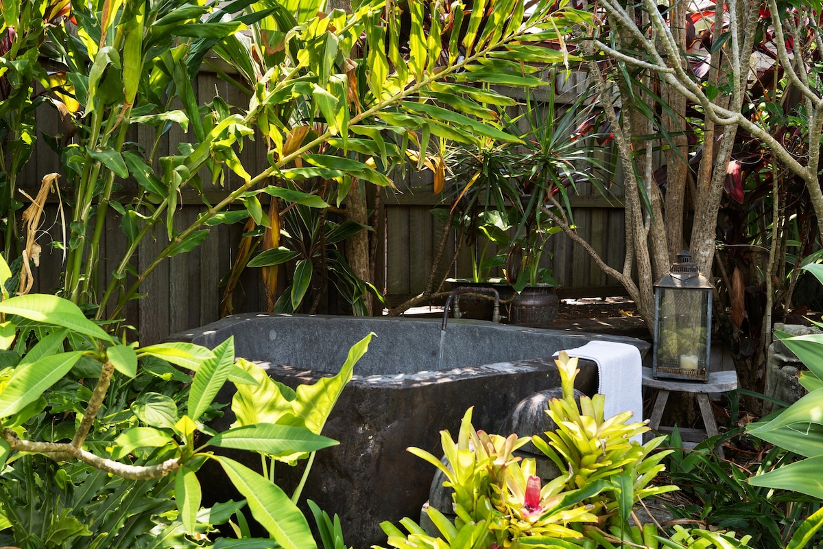 Hermosa casa de campo espaciosa y ultramoderna situada en 5 acres de exóticos jardines botánicos subtropicales con bolsillos naturales de selva tropical y arroyo, donde puedes olvidarte de ti mismo y simplemente ser. Un impresionante espacio privado totalmente vallado para un máximo de 4 personas para relajarse y disfrutar de la tranquilidad del jardín acuático balinés circundante y su propia piscina privada y jacuzzi para 5 personas en un hermoso cenador. Espacio totalmente tranquilo, pero a solo 15 minutos de Mullumbimby, Brunswick Heads y playas oceánicas.