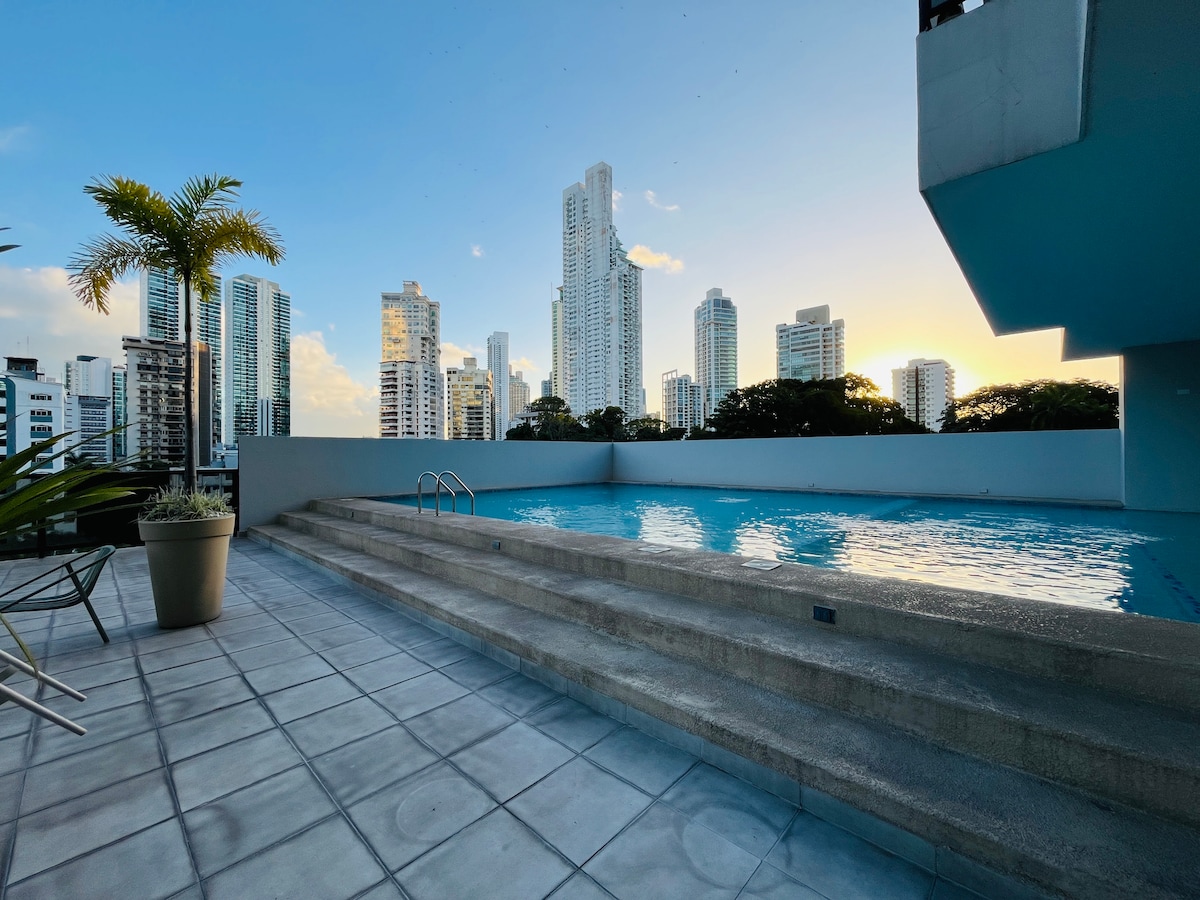 Relájate en este apartamento moderno y luminoso, con vista panorámica a la ciudad, piscina y rooftop, ubicado en calle 50 ubicado en unas de las zonas mas céntricas y convenientes de Panamá Descubre una experiencia cómoda y segura en pleno corazón de la ciudad, a pocos pasos de Casco Antiguo y de la estación del metro Iglesia del Carmen. Su ubicación privilegiada te conecta con zonas comerciales, restaurantes, la cinta costera y los principales puntos de interés de la ciudad