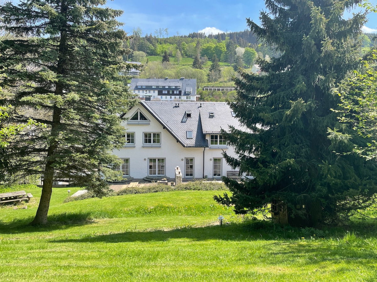 El apartamento único, en el elegante bungalow de los años 60, está situado en el centro de Winterberg y justo al borde del bosque: bellamente amueblado, apto para bebés y niños pequeños, con cocina totalmente equipada, wifi gratuito, cama tamaño king, PS4, sofá cama grande, aparcamiento privado, 2 balcones con barbacoa y calefacción por suelo radiante. Para excursionistas, familias y aquellos que aman la paz y la tranquilidad :) El apartamento totalmente modernizado para un máximo de 4 personas, con vistas al salto de esquí y a la pista de esquí, ofrece una estancia inolvidable.