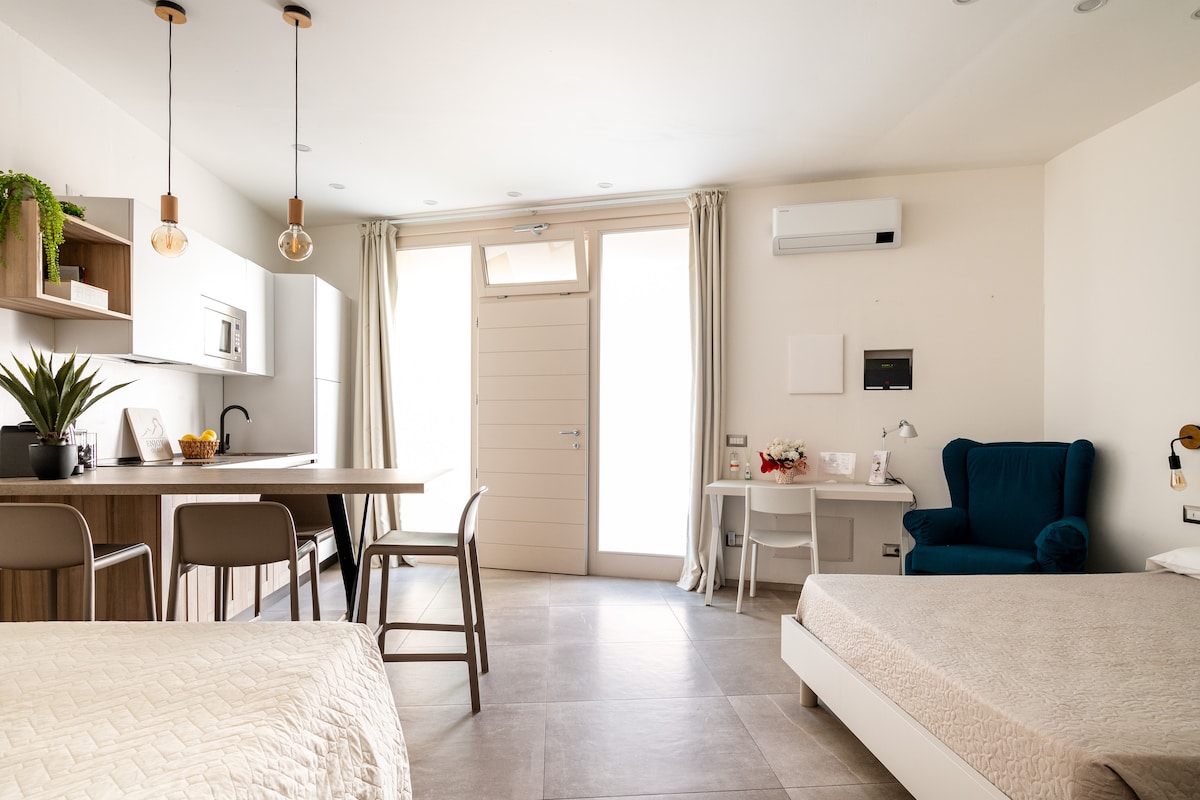 ¡Estudio bien equipado! Recientemente reformado, consta de una única sala de estar/dormitorio con cocina americana, además de un baño moderno y confortable, de tamaño adecuado. La cama doble, tamaño Queen, está equipada con dos mesitas de noche, un armario, un escritorio y un sofá que, bajo petición, se convierte en la segunda cama. Lavadora-secadora, lavavajillas, microondas, nevera y congelador, placa de inducción, cafetera y hervidor de agua. Que disfrutes de tu estancia en Olbia