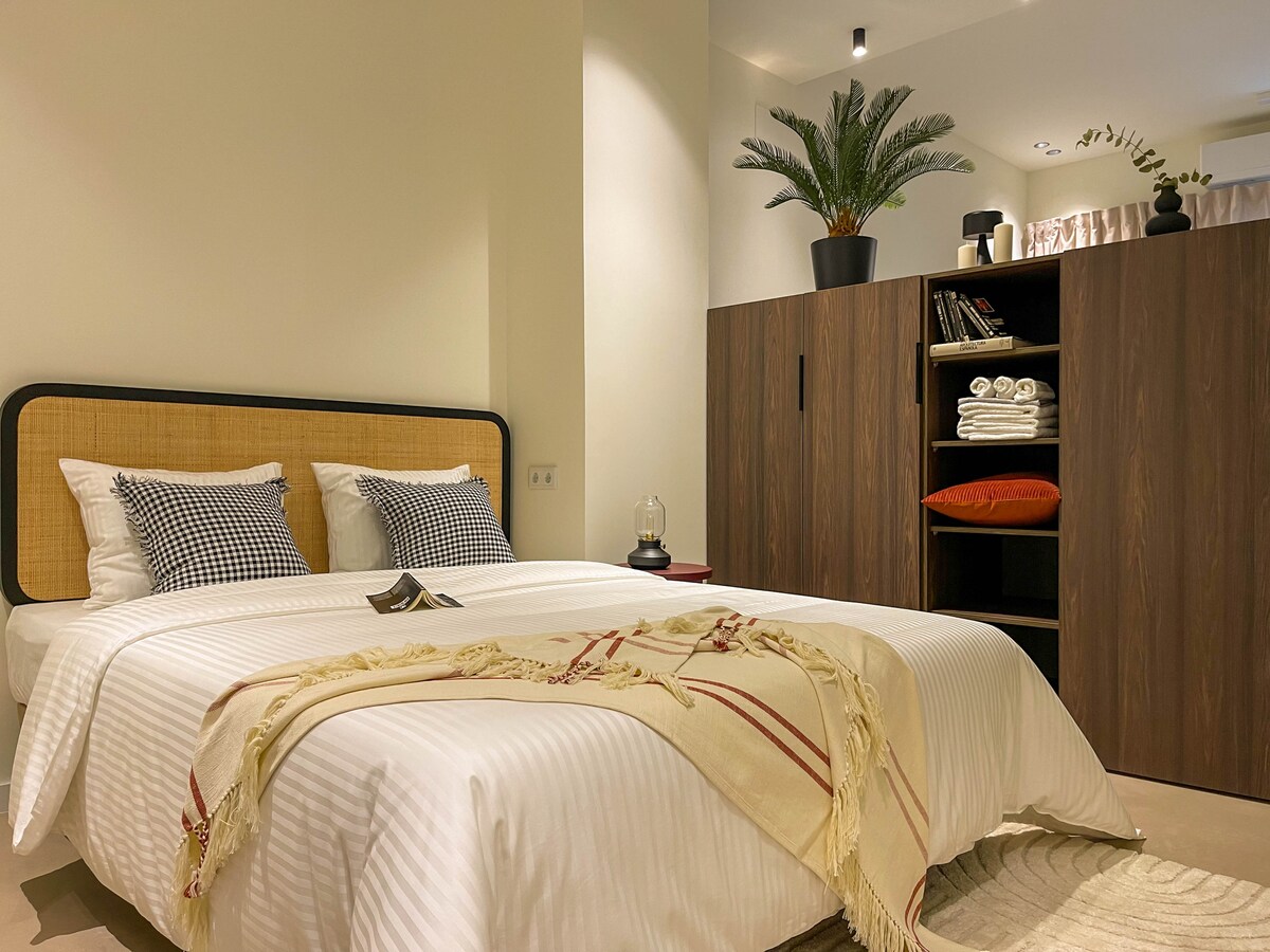 Elegante estudio de 56 m2 con cama tamaño queen y patio de 25 m2, perfecto para una persona, dos amigos o una pareja. Ubicado en una zona tranquila pero céntrica. A 10 minutos a pie de Russafa, donde encontrarás todos los cafés, tiendas y bares de moda. A 2 minutos a pie de los Jardines del Turia, donde podrás admirar los futuristas edificios de la Ciudad de las Artes y las Ciencias y caminar o recorrer en bicicleta los 9 km de espacio verde que rodea el casco antiguo. A unos 20 minutos a pie del casco antiguo. Fácil conexión en autobús a la playa.