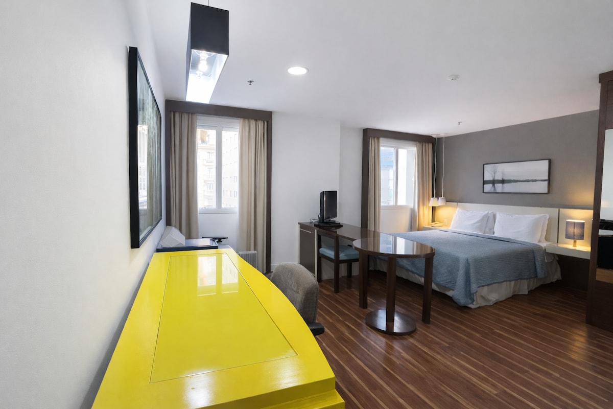 Departamento con minicocina en la mejor ubicación de São Paulo, a una cuadra de la Av. Paulista, a 450 m de la estación Trianon Masp. Con Internet de alta velocidad en el apartamento y una buena mesa de trabajo. TELEVISIÓN de 65 pulgadas. 1 cama King Size O 2 camas individuales, solo háganos saber. Está en un hotel de 4 estrellas con un excelente gimnasio y sauna incluidos en la tarifa. Con plancha y tabla de planchar. Un garaje incluido. 2 restaurantes (uno con increible vista de la ciudad).