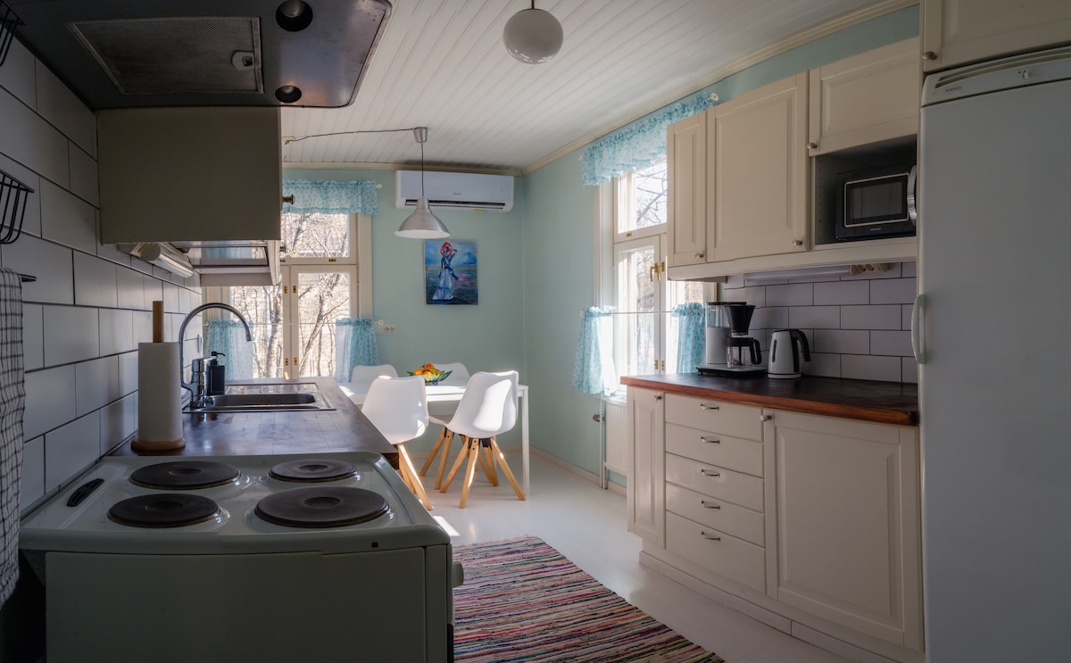 This cozy cottage welcomes you to spend relaxing get-aways and longer remote work stays in the middle of beautiful and peaceful finnish nature. Cottage has two spacious cabins, a well-equipped kitchen, and a good sauna. The charming swimming pond is just a few steps and stairs away from the cottage. There is good wifi, big sunny lawn and no neighbours in sight - so you can swim in your birthday suite if you want :) The nearest grocery store is 12 min ride away.