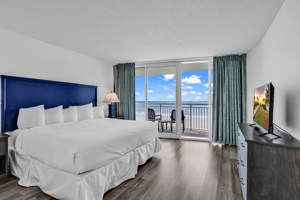 <b>Séptimo piso | Frente al mar (huéspedes máximo 6) - 652 pies cuadrados </b> 1 dormitorio | 1 baño | Balcón privado | Lavadora y secadora en la unidad 2 camas tamaño queen | 1 sofá cama El huésped principal registrado debe tener 25 años o más para hacer el check-in Perfecto para familias, solteros, parejas. ¡Huéspedes de todas las edades son bienvenidos en esta propiedad! Comodidades del centro vacacional frente al mar: piscinas interiores y al aire libre, río lento, jacuzzi Estacionamiento cerrado adjunto: estaciona y entra desde el garaje ADA accesible - No se requieren escalones, puertas anchas
