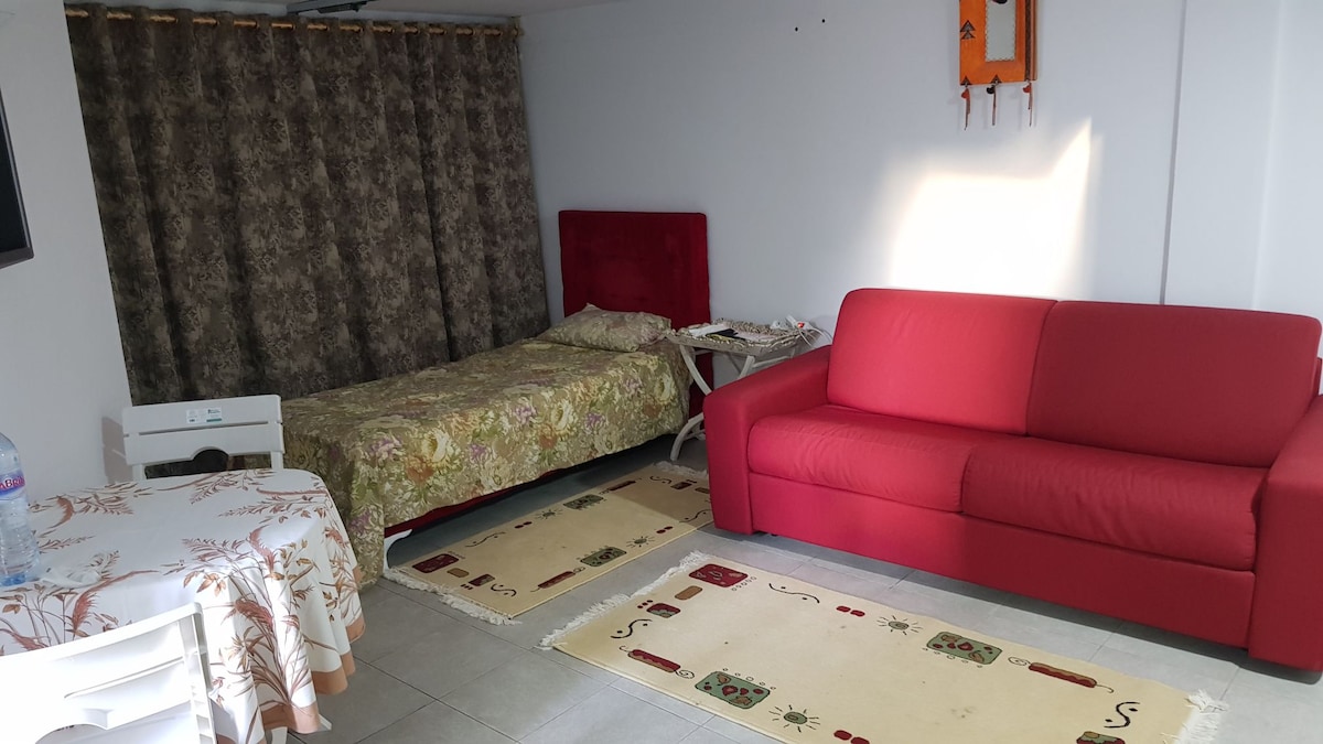 Logement de vacances (climatisé) constitué de 2 chambres à coucher, un salon, une entrée, une cuisine spacieuse et bien équipée et une salle d'eau avec douche à l'exterieur. L'appartement est au sous-sol mais très lumineux et aéré grace à ses plusieurs fenêtres. L'appartement a une porte d'entrée privée et se situe à quelques minutes de la plage dans une zone résidentielle très vive. Lits disponibles: 2x single, 1x double, 2x grands canapés au sallon, possiblité d'ajouter des matelas au sol.