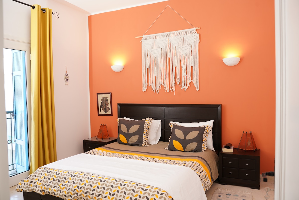Este alojamiento tiene un estilo decididamente único. Un apartamento elegante, una decoración refinada, cuadros de pintores tunecinos de renombre. Bien situado, en pleno centro de Nabeul, junto al mar, este apartamento le ofrecerá una estancia tranquila y agradable. Una vista impresionante, todas las ventanas ofrecen vistas al mar. Ciudad costera, situada cerca de Hammamet, elegante balneario, la ciudad de Nabeul tiene una hermosa medina y es conocida por su buena cocina tradicional.