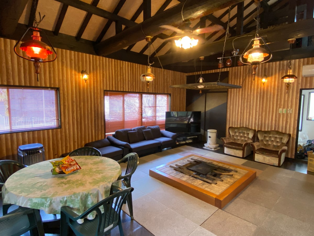 Una villa construida por Miyadaiku en un gran sitio cerca de la ciudad.El amplio salón comedor abierto con una mesa irori de 30 tatamis te permitirá relajarte.La habitación de estilo japonés es un edificio limpio único de Miyakai, y no se siente como si hubiera sido construido durante 34 años. Hay estacionamiento gratuito para 6-7 autos en las instalaciones, lo cual se recomienda para grupos de autos. Hay una casa al este en el jardín donde se puede comer y hacer barbacoa afuera.También hay un estanque de natación koi en el patio trasero. Puedes tomar un baño (600 yenes) en las aguas termales naturales del hotel cercano en 1 minuto♨️ a pie.Family Mart también está a 1 minuto a pie.El supermercado más cercano está a 1 km. El interior del edificio está limpio y ordenado, y está totalmente equipado con todas las comodidades y utensilios de cocina necesarios, lo que ofrece un entorno cómodo para estancias prolongadas.