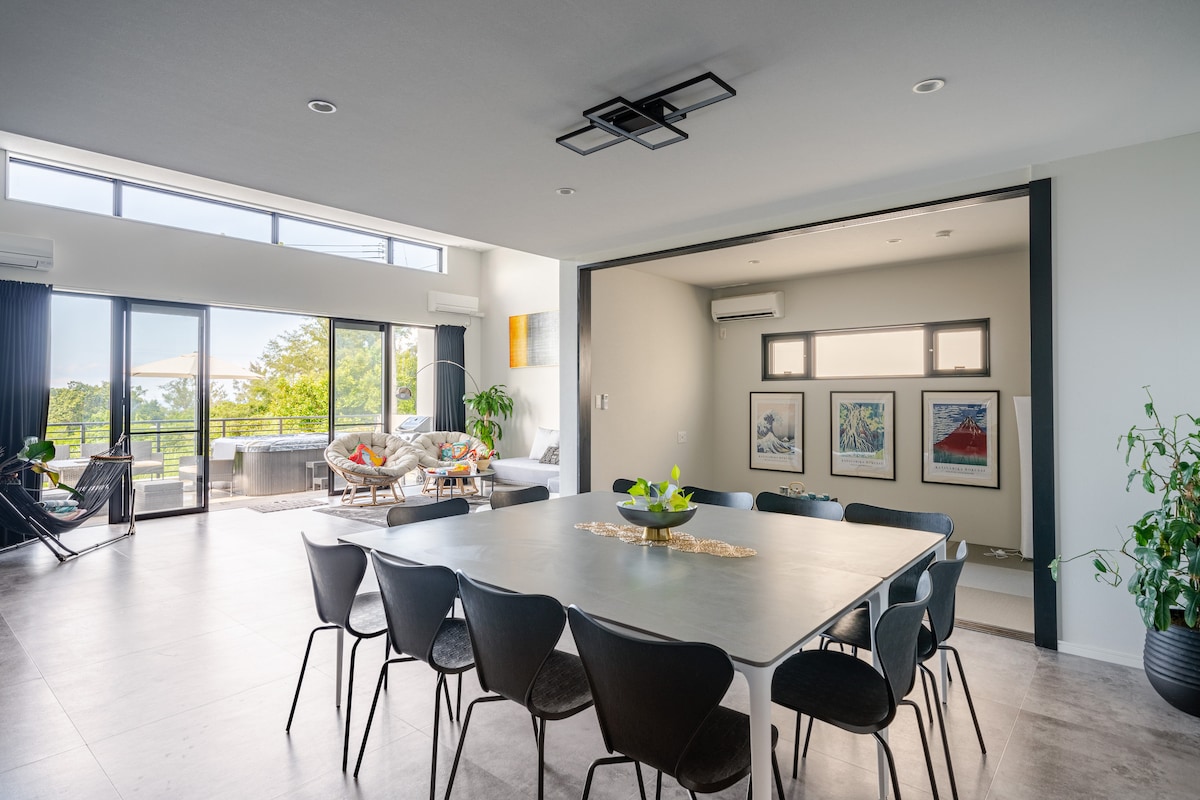 [Villa privada de alquiler de nueva construcción que ofrece vistas impresionantes y lujo] A 50 minutos en auto del Aeropuerto Internacional de Naha. Disfruta de la costa oeste de Okinawa en una terraza con vista a la playa de Maeda en Onna Village. [Una cómoda casa de un solo piso con movimiento interior suave] - 3 dormitorios + habitación de estilo japonés con capacidad para hasta 14 personas. - Espacio para fiestas con una mesa grande con capacidad para 14 personas. - Tiempo de relajación excepcional con un gran jacuzzi privado al aire libre. - Totalmente equipado con un auténtico mostrador de bar. - Disfruta del entretenimiento en un televisor grande de 80 pulgadas. [Todo incluido y excelentes servicios] - Alcohol, refrescos, refrigerios, helado, etc. gratis en el salón. - Desayuno incluido. - Disfruta de una auténtica barbacoa con una parrilla Weber de alto rendimiento. - Hora de salida relajada (hasta las 11 en punto) [Excelente ubicación, a pocos pasos de la playa de Maeda] Servicios de lujo y servicio todo incluido sin estrés, Y es un espacio perfecto para crear recuerdos especiales con hermosas vistas. Disfruta de un momento de lujo con tu familia o amigos.