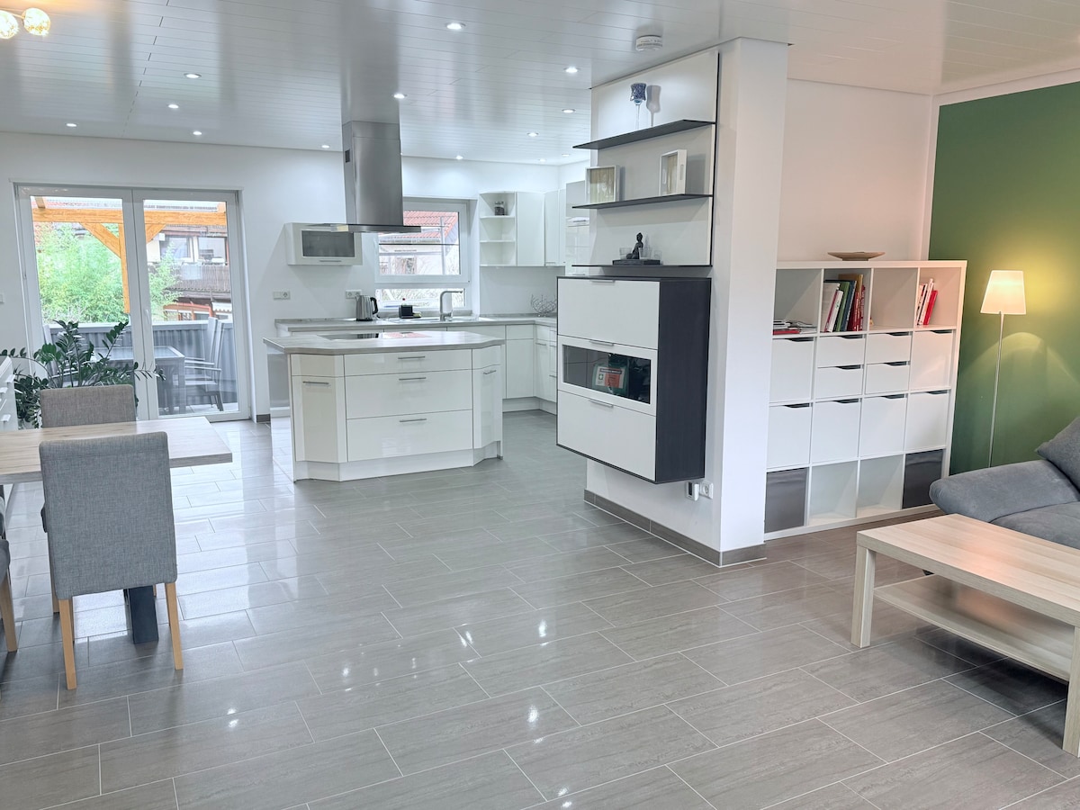 Wunderschöne, gemütliche Wohnung Entspannen Sie sich in unserer komplett sanierten, modern eingerichteten Ferienwohnung. Die Wohnung befindet sich im 1. OG eines Zweifamilienhauses -75 qm Wohnfläche - Schlafzimmer mit Doppelbett - Wohnzimmer mit Couch und Kojenbett: zwei Liegeflächen jeweils (100 x 200 und 90 x 200) - komplett eingerichtete Küche - Esszimmer - modernes Duschbad mit Handtüchern, Fön und Pflegeprodukten - kostenloses WLAN - Smart TV - Fahrradraum (Lademöglichkeit für E-Bikes)