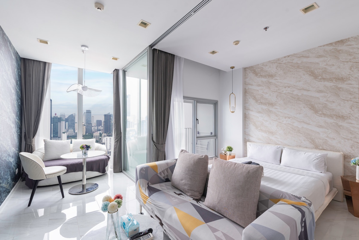 Estudio B4D en el centro de la ciudad/cerca del metro/vistas de la ciudad desde lo alto/área comercial de Siam/recogida gratuita/piscina al aire libre/gimnasio/bar en la azotea/recogida y traslado al aeropuerto por cuatro noches