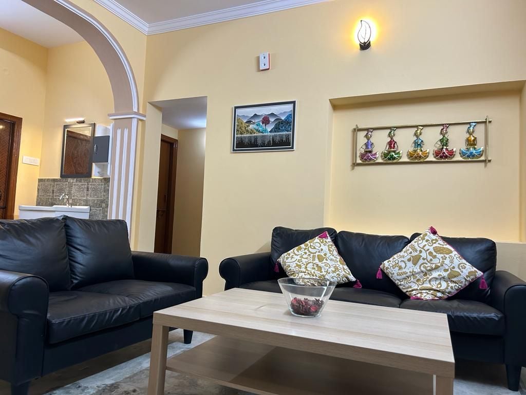 Welcome to your ideal home away from home. Our apartment is on the first floor of the villa without a lift, exclusively for the families only. Unmarried couples and Bachelors are restricted. Our apartment is spacious. A/C in both the bedrooms, with attached bathrooms. Featuring two spacious bedrooms, our retreat ensures a peaceful night's sleep . The master bedroom is with a king-size bed, while the second bedroom is with a queen-size bed, and two additional floor mattresses.