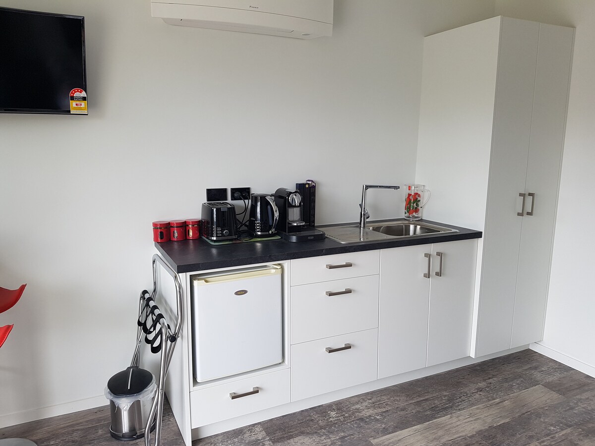 Ofrecemos nuestro estudio independiente bien equipado y adjunto a nuestra casa. Un espacio privado con aire acondicionado y acceso propio a través de la llegada autónoma. Aparcamiento gratuito fuera de la calle. Una base maravillosa para tu estancia en Hawkes Bay. El dormitorio independiente tiene una cama tamaño queen. Tienes un salón con cocina americana, un baño grande y un aseo separado. Una lavadora. Hay un patio privado bañado por el sol con muebles de exterior, sombrilla y barbacoa de gas para relajarse y descansar después de explorar nuestra hermosa región.
