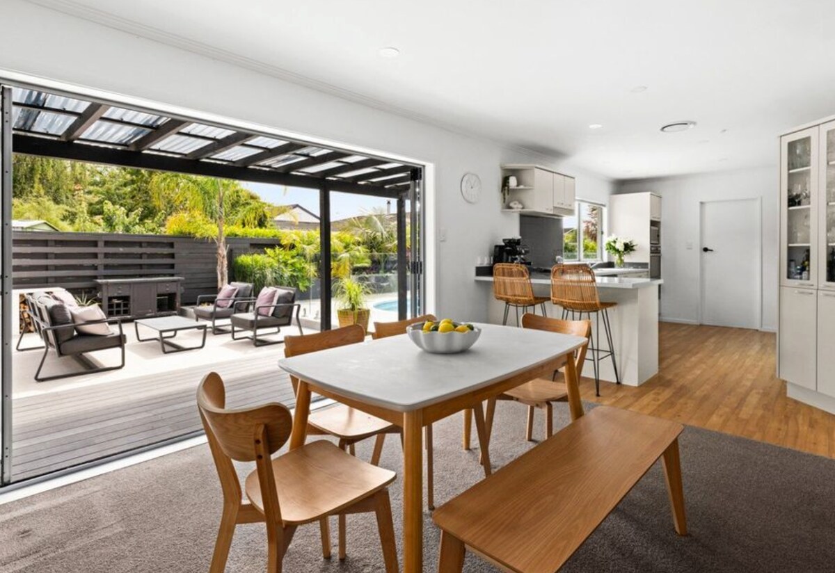 A contemporary Art Deco house in the heart of Havelock Village perfectly set up for families, larger groups, or peaceful retreats. Complete with heated swimming pool (Oct to April), large outdoor fire, mini Weber BBQ, Delonghi espresso machine, and new kitchen & bathrooms (July 2024). Bathroom, laundry, & kitchen essentials are provided for your stay. The kitchen is fully equipped with everything you need from morning coffee to wine & platters, or cooking at home with kids.