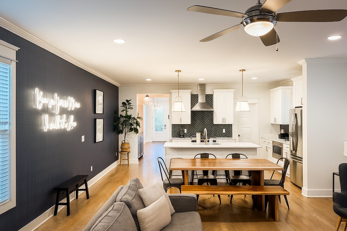 ¡Superanfitrión de Airbnb y siempre un Favorito entre huéspedes! ¡Siempre es un favorito de los huéspedes! Disfruta de esta hermosa casa de 3 niveles con 4 dormitorios, 3 baños completos y 2 salas de estar. ¡Está amueblado profesionalmente con comodidades de lujo, electrodomésticos de alta gama y una increíble terraza en la azotea con un televisor de 65pulgadas! ¡Hay mucho espacio para todo tu grupo! Se adjunta garaje para 2 autos y estacionamiento en la entrada. ¡A poca distancia a pie de tiendas 12th S, restaurantes, Publix, Hattie B's Famous Chicken y MÁS! NOTA:Actualmente hay algunas obras al lado.