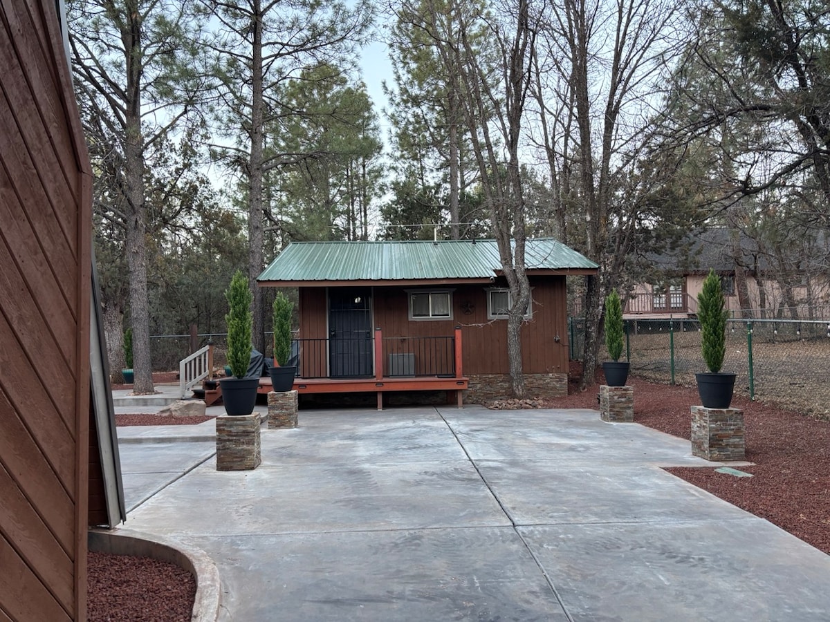 ¡¡¡TODOS A BORDO!!! ¿Por qué no te quedas en un lugar único y divertido en tu viaje? Este no es un verdadero furgón de cola, sin embargo, es un espacio privado de 350 pies cuadrados hecho para parecerse a uno : ) Nuestra hermosa, tranquila y limpia propiedad está ubicada en los altos pinos de Pinetop y limita con el Bosque Nacional en una calle pavimentada y sin salida. Las rutas de senderismo están a pocos segundos de la puerta principal, pero aún así está cerca de la ciudad. Una sala de estar privada con una fachada de 1800 es para el uso de los huéspedes. Esta cabaña tiene capacidad para 2 personas. ¡Sin gastos de limpieza!