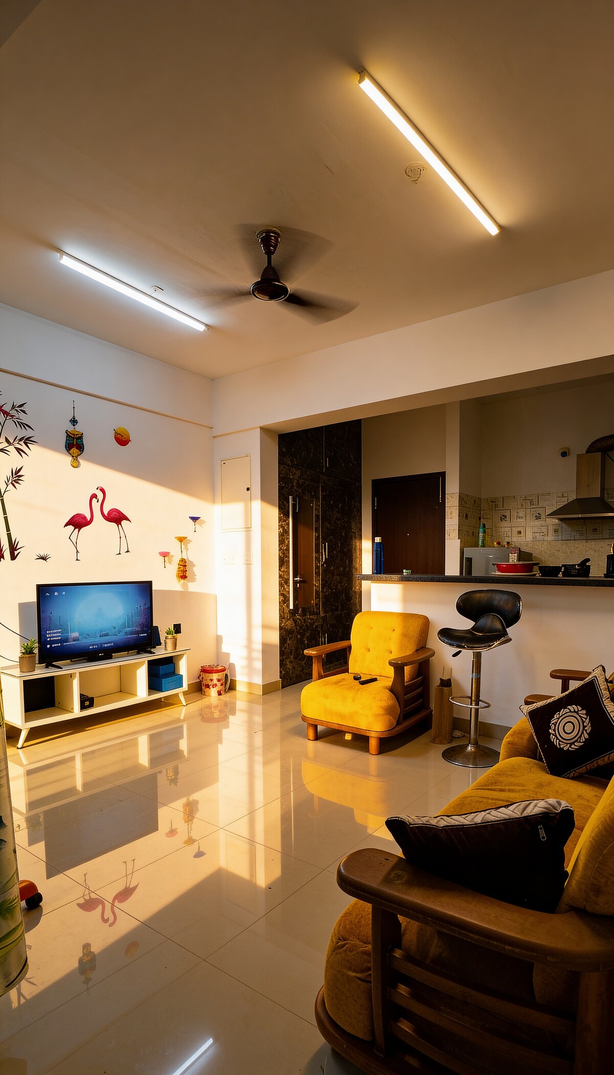 Executive Studio @ SIPCOT OMR. Experience smart luxury near Marina Mall. This AC studio features a 55" 4K TV (Netflix) and ambient lighting for cinema vibes. The plush lounge transforms into a premium bed for deep sleep. Work-ready with High-Speed WiFi. Includes Washer/Dryer, fully stocked kitchenette & huge Wardrobes. Hotel-grade hygiene with the bonus of a Kitchen & Washer/Dryer. Perfect for executives, couples. Designed for long stays and short stays. Seamless Self Check-in.