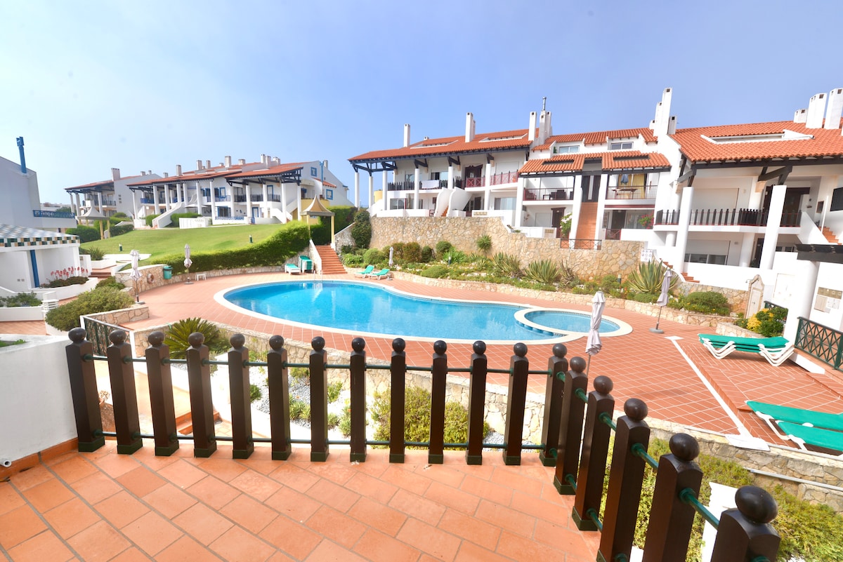 Nazaré apartment with stunning sea view, two bedrooms, a bathroom with hydromassage, barbecue and outdoor pool, sleeps 4 people -Two bedrooms with double bed each -A bathroom with toilet, sink and bathtub with hydromassage -Fully equipped kitchen. -Television and internet access - Air conditioning - Outdoor pool, children's playground and communal barbecue area on site - Bed linen, towels and hairdryer included. Come and discover Nazaré and its famous giant waves!