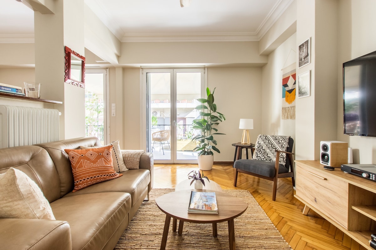 Disfruta de un elegante refugio de 2 dormitorios y 1,5 dormitorios, un oasis luminoso y lleno de plantas a pocos pasos de la colina Lykabettus. Entre el exclusivo Kolonaki y la animada Exarchia, disfruta de tiendas boutique, joyas ocultas y cultura. - Ubicación céntrica privilegiada - Espacio artísticamente diseñado con una hermosa terraza. - A 10 minutos a pie del metro Panepistimio. - Televisión inteligente, aire acondicionado, calefacción autónoma y agua caliente Perfecto para: 🌿 Parejas que buscan una escapada elegante a la ciudad 👥 Amigos y familias que quieren una estadía vibrante ¡Consulta o lee a continuación!