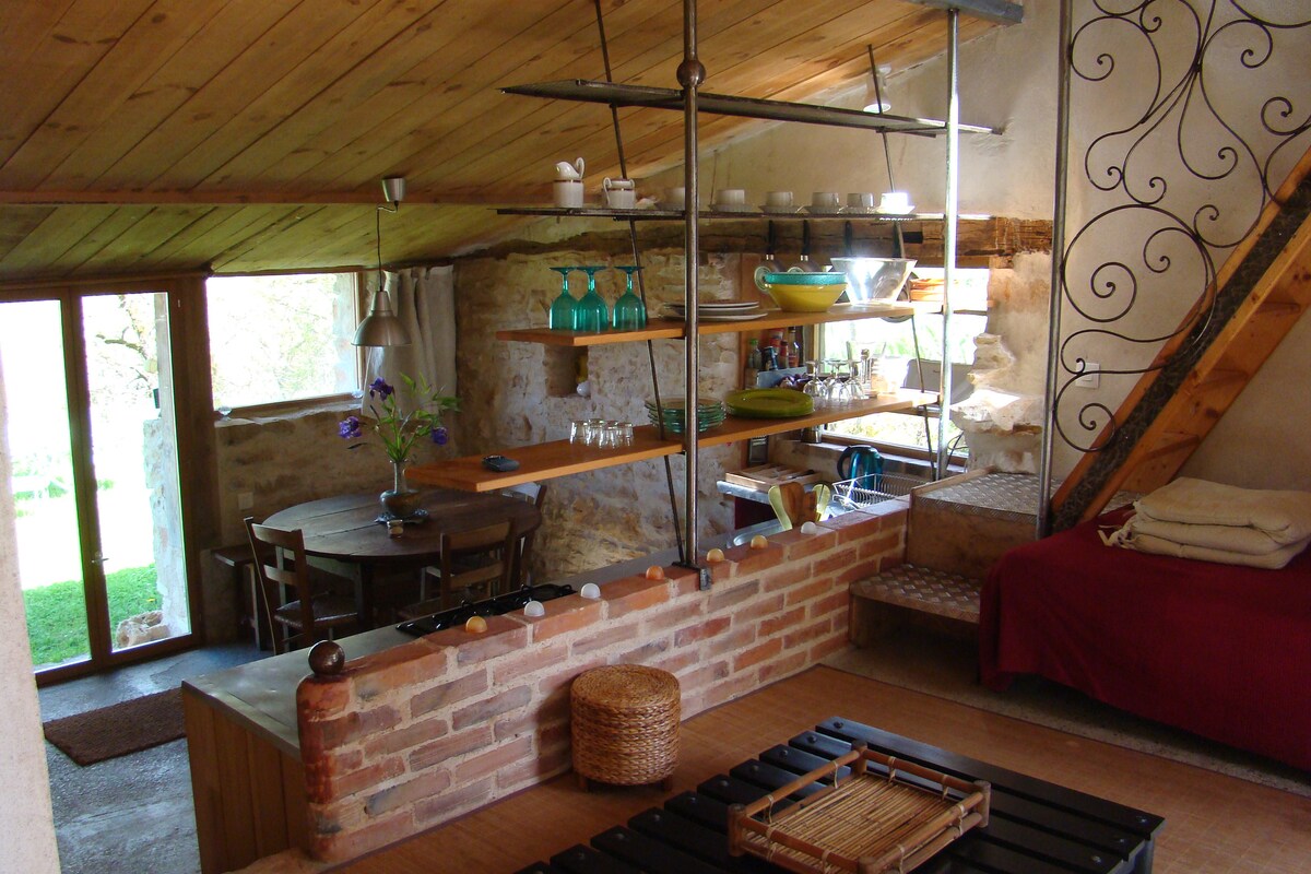 Nid surplombant une mer d'arbres. Ancien four à pain devenu une maison lumineuse à l'abri des regards, avec une petite cour japonisante à l'entrée, un jardin à l'arrière donnant sur une forêt, au cœur du Quercy. Rez de chaussée en pierre, étage en bois, poêle à bois (indispensable l'hiver !), chemins de randonnée immédiatement accessibles, nombreuses activités culturelles et sportives dans la région. Idéal pour amoureux de la nature, des promenades, du calme.