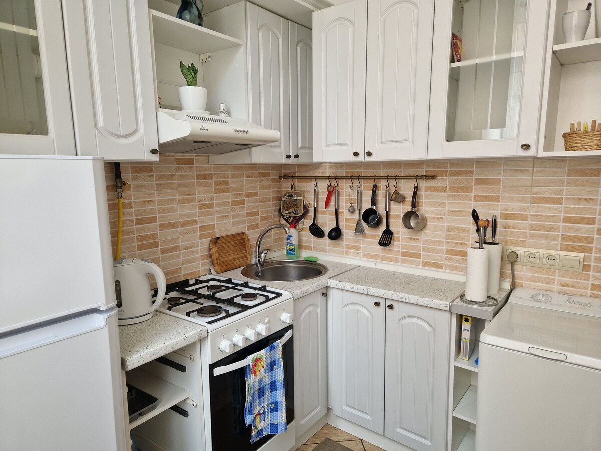 A stylish apartment in the center, designed in Scandinavian style with vintage furniture and modern art. It is located a 15-minute walk from the beach and 10 minutes from the central park, surrounded by many restaurants and bars. A pre-revolutionary building with a cozy Odessa courtyard. The apartment features a separate bedroom with a double bed and a comfortable sofa bed in the living room. The apartment is fully equipped with everything you need.