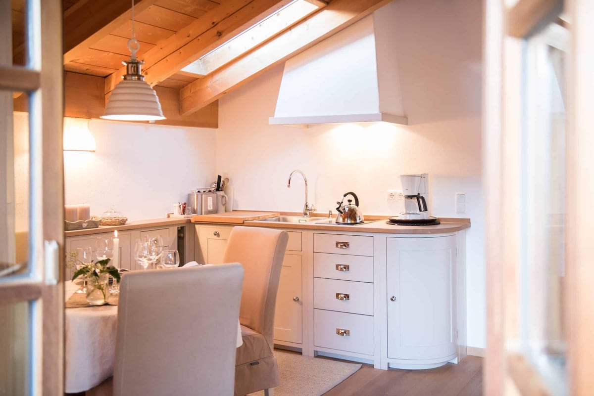 Original tirolés. Casa rural de 250 años cuidadosamente restaurada. Bonito y tranquilo apartamento de dos habitaciones de 42 m² en una ubicación muy céntrica. Apartamento muy bien reformado en una ubicación céntrica en St. Johann en Tirol con un gran jardín de 3000 m². Dormitorio con cama doble (160 cm) y posibilidad de añadir una cama supletoria o una cuna. Sala de estar con cocina integrada totalmente equipada y cómodo asiento para hasta 6 personas. Sofá cama en el salón. Trastero. Cuarto de baño grande con inodoro, ducha y ventana.
