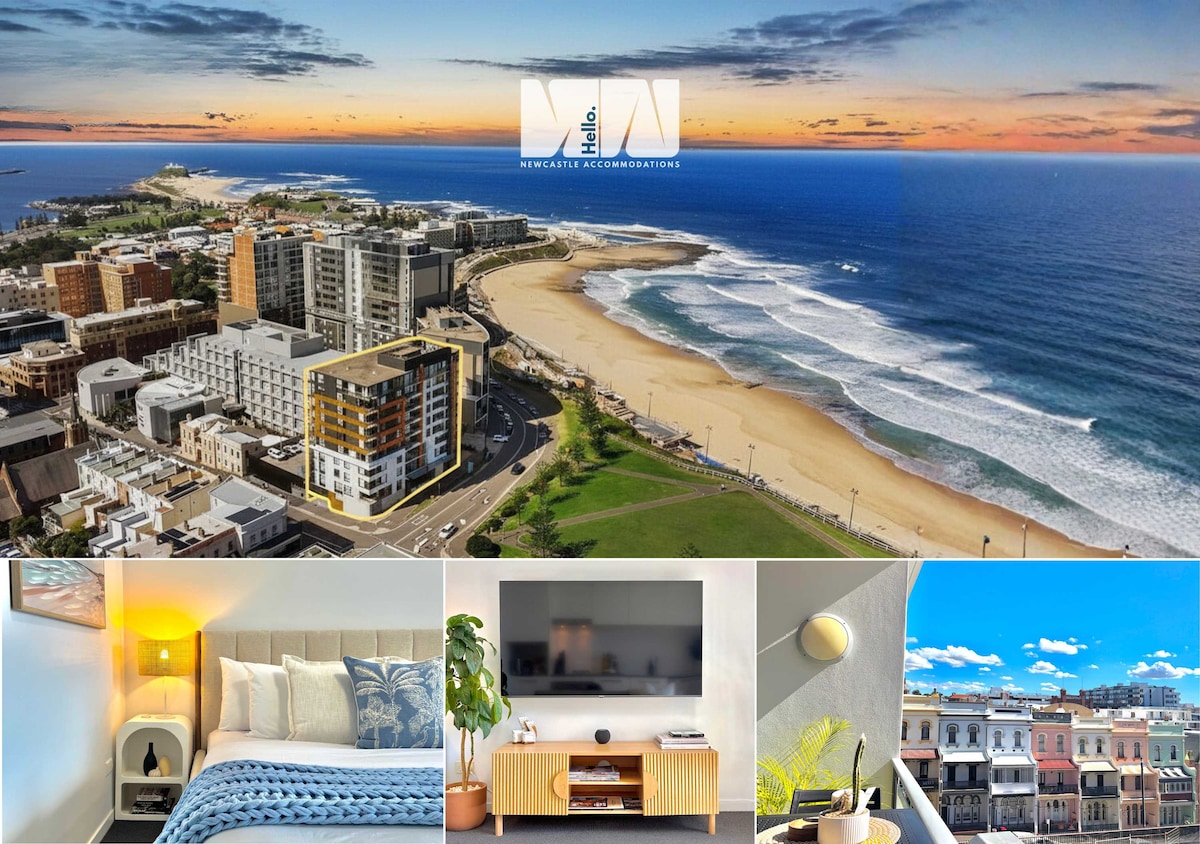 Stylishly appointed, near new, penthouse apartment (14th floor) overlooking pristine Newcastle Beach & adjacent Oceans Baths. Fabulous Cafes right downstairs, 5 min walk to city centre busting with great bars, restaurants and shops. You can walk everywhere from here whether on business or pleasure. Private 1 car park underground (+visitor parking). Comfy queen bed so you can wake up and see dolphins & whales migrating & the best view in Newcastle. Sip coffee or cocktails on the balcony. Just BE