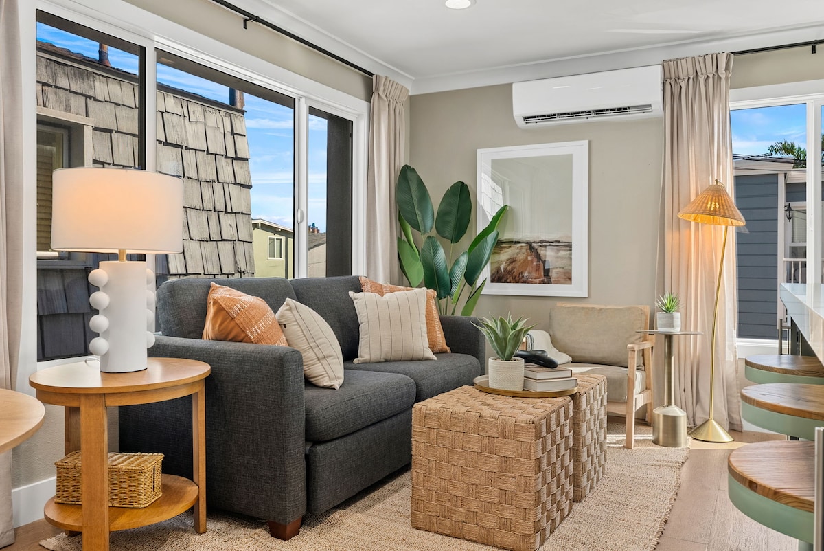 Suite privada en la planta baja con puerta delantera cerrada con llave y puertas francesas traseras cerradas con llave al patio. Cama tamaño queen, mininevera, microondas, agua, fruta, barritas nutritivas y una menta para tu almohada. Además, incluye el uso de bicicletas, tablas de surf, tablas de boogie, toallas de playa y sombrilla. Para obtener más información, lee las más de 300 reseñas de cinco estrellas.