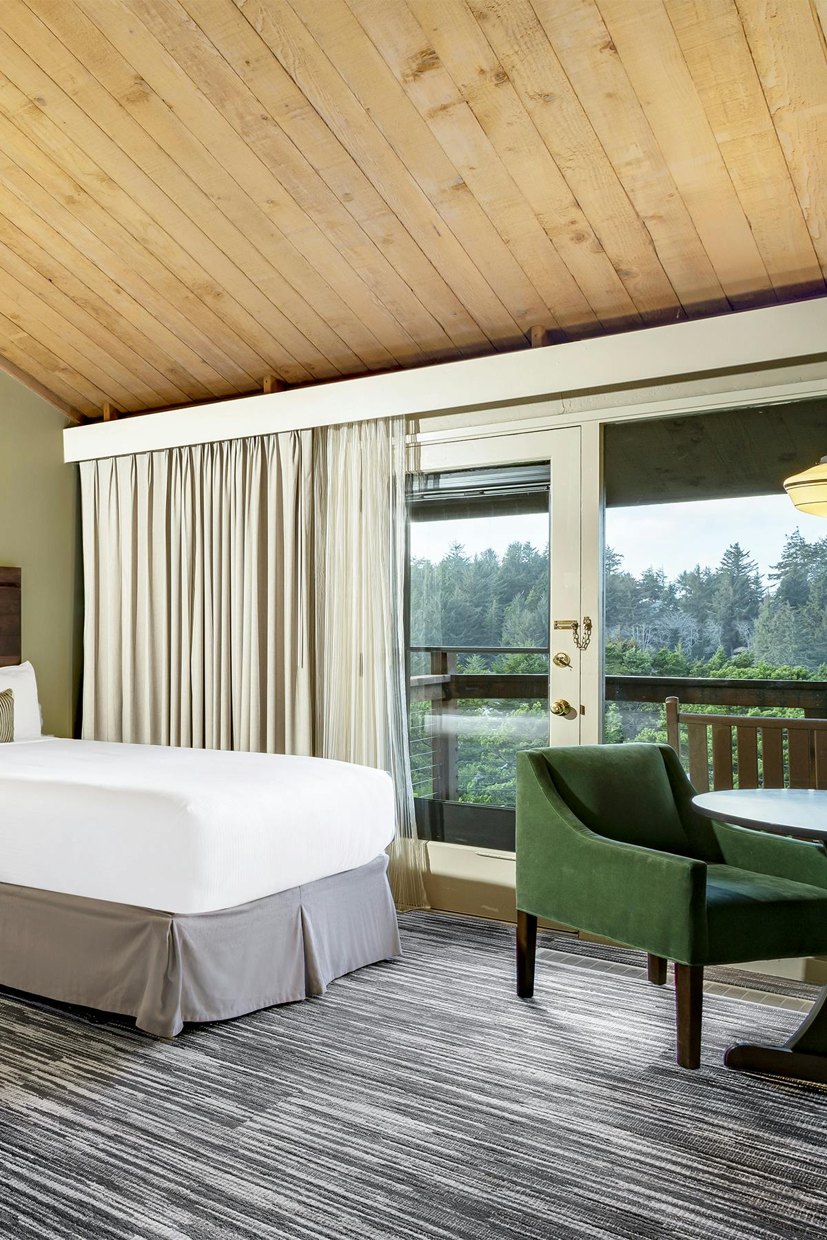Our queen room offers guests an inviting place to rest and unwind after a day of exploring the Oregon Coast. Offering a queen-size bed with a plant-based foam mattress and eco-friendly pillows and sheets, Queen Rooms also include a 55” flat-screen television, a Himalayan rock salt lamp, a sound machine, and a bathroom with a tub/shower combo. Queen rooms are located on the ground level and have a private patio with a view of the harbor.