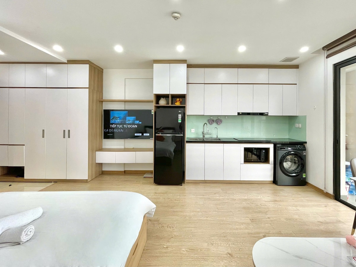 - Esta es una cadena de apartamentos modernos ubicados en los lujosos complejos de apartamentos de Hanói. Vinhomes D'Capitale, uno de los mejores lugares para vivir, cada apartamento está decorado con buen gusto, limpio y reluciente y tiene una gran vista a la ciudad, con vistas al lago desde los mejores pisos. Ofrecemos alojamiento perfecto para parejas, familias o viajeros solteros. - Este nuevo estudio tiene 1 cama tamaño queen, 1 baño privado, sala de estar con un cómodo sofá para que te relajes con un televisor inteligente.
