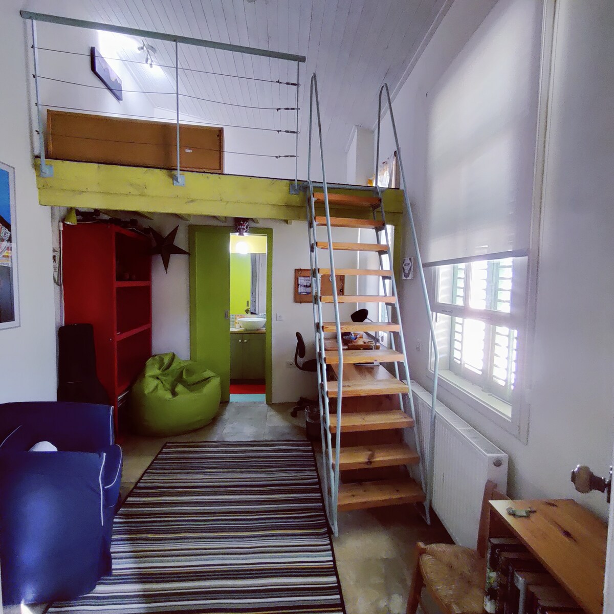 Este departamento, un antiguo taller de electrónica convertido en un simple escondite, combina el carácter vintage con un toque crudo y bohemio. Las alfombras llamativas, los colores vivos y los muebles recuperados marcan el tono, mientras que las superficies preservadas, incluidos los pisos desgastados y las ventanas antiguas, le dan un encanto sin pulir. ¡Es un espacio habitado con personalidad! Limpio, funcional y sencillo.
