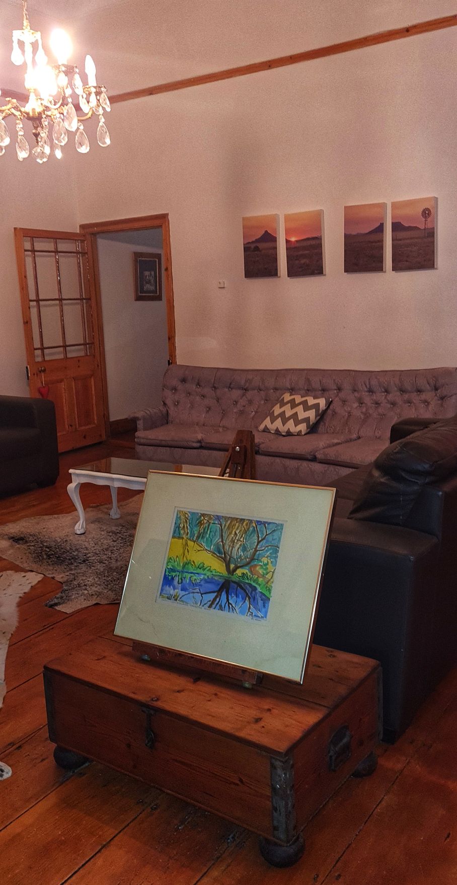 A historic house with whitewashed walls and Oregon floors and ceilings. It has three bedrooms, two of them with double beds, both with French doors opening to a private garden. The third is a twin room. The house has a large open-plan kitchen/living room. A stay should include a tour of the stunning art and giant tapestries made by local Bushmen descendants. The three galleries and the studio give visitors a chance to see local artists at work and chat with them about their heritage.