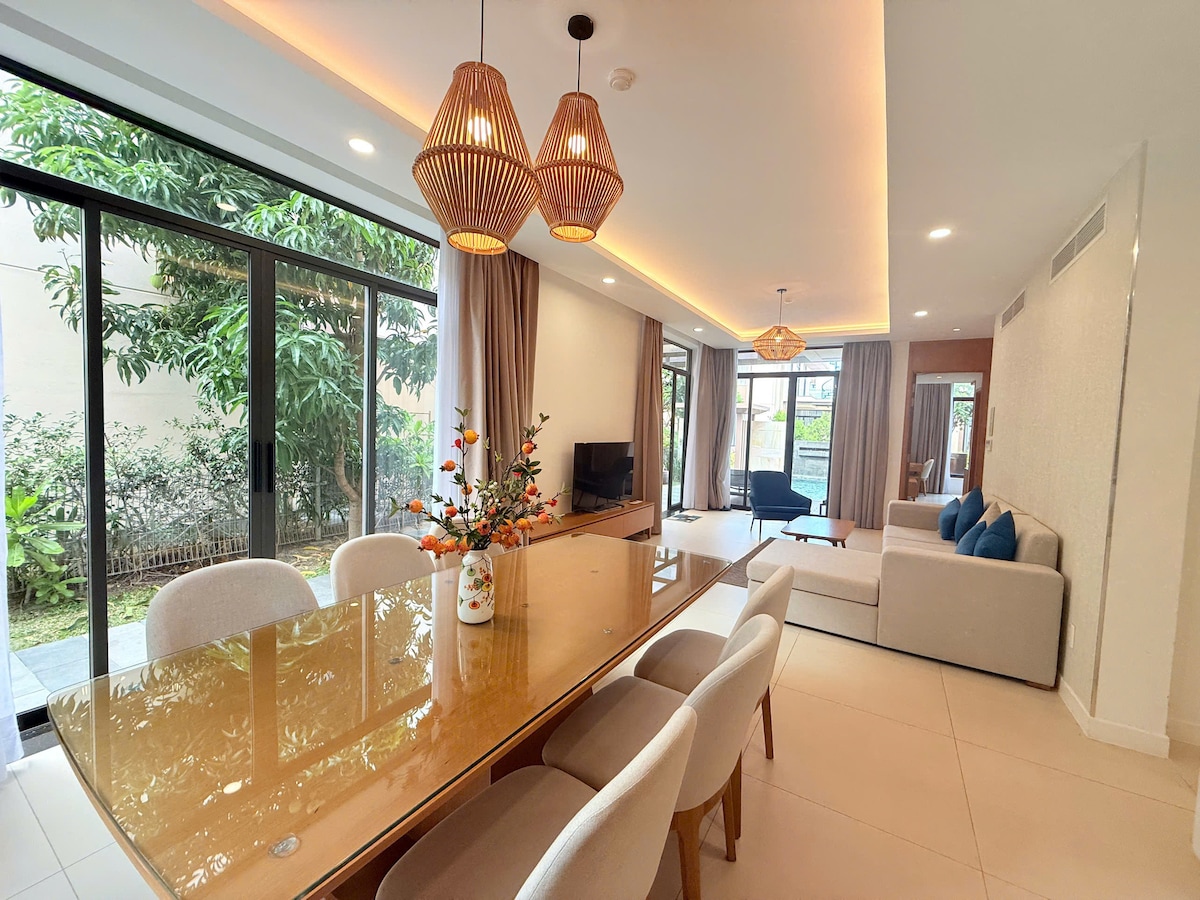 La villa Green Garden está en armonía con la naturaleza, con playa verde, villa con espacio verde fresco, sensación relajante y tranquila... Con diseño de 2 pisos, 3 dormitorios modernos, aireado, cómoda bañera relajante La villa tiene una amplia sala de estar, adecuada para familias o grupos de amigos que quieran tener un cómodo espacio para comer, organizar una fiesta de barbacoa al aire libre junto a la piscina de enfriamiento real. Cocina llena de herramientas para procesar, microondas, horno eléctrico gratuito