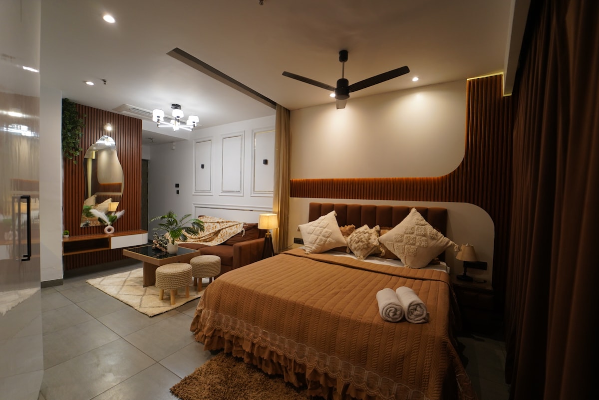 El primer apartamento de 2 Bhk que cumple con todos los requisitos ✨ - 2 dormitorios ( dormitorio principal, segundo dormitorio). - Dos camas tamaño king. - Una amplia sala de estar con una cómoda disposición de asientos. - 2 baños ( 1 en cada uno de los dormitorios). - Cocina pequeña (con todos los utensilios básicos de cocina disponibles y servicios abastecidos, es el lugar perfecto para preparar tus comidas favoritas) - Una zona de balcón compartido que conecta con el apartamento, que puede ser el espacio perfecto para tus paseos nocturnos. ¡Reserva ahora!