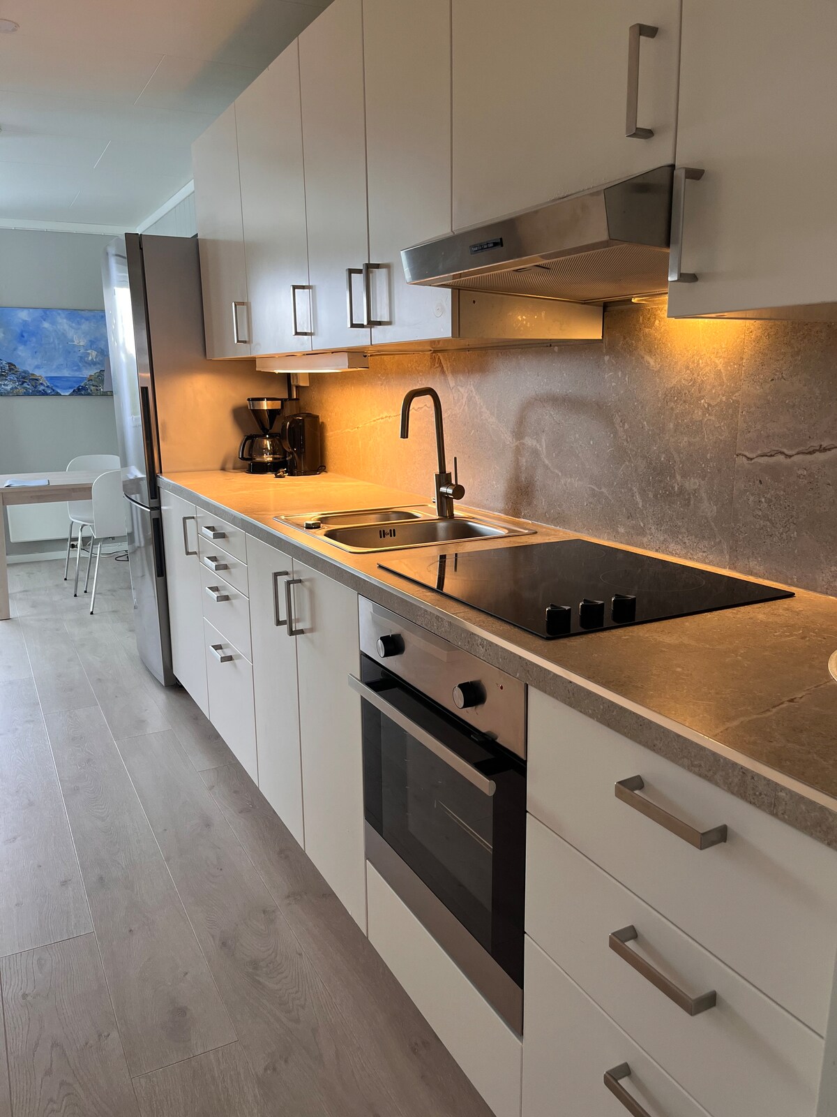 Praktisk, moderne og koselig leilighet med soverom (dobbeltseng) og hems (2 enkle senger). Kjøkken med alt du trenger til matlaging og romslig sitteplass. Minihuset ligger på en privat eiendom med grøntområder rundt. Parkering rett utenfor inngangsdøren.